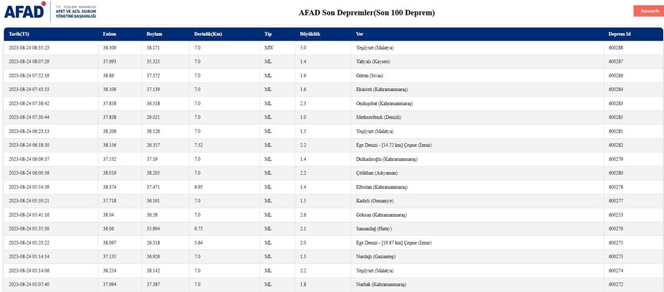 Deprem haberlerine gün içerisinde yenileri ekleniyor. Oturdukları kentlerde sarsıntı hisseden vatandaşlar, Afet ve Acil Durum İdaresi Başkanlığı (AFAD) tarafından yayımlanan son zelzeleler listesini inceliyor. AFAD tarafından paylaşılan 24 Ağustos tarihli son sarsıntılar datalarını derledik.