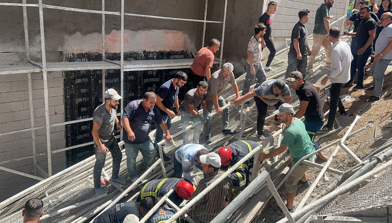 Nar beldesi Adnan Menderes Bulvarı’nda imali süren konut inşaatının iskelesi şimdi belirlenemeyen nedenle çöktü.