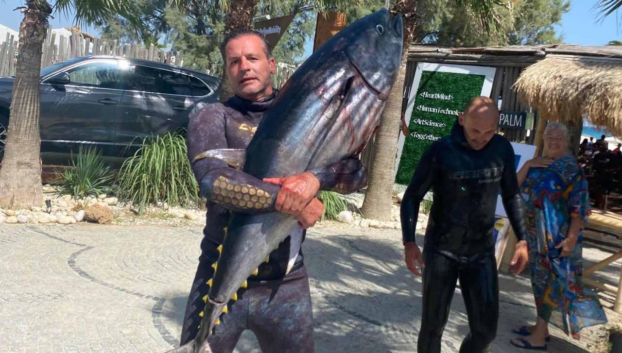 Derin sulara açılan Nihat Altınkaya, 70 kiloluk bir orkinos yakaladı.