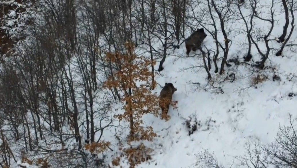 Koyun sürüsüne eşlik eden çoban köpeklerinin koku alarak ormanlık alana hakikat gitmeleri üzerine Baki Kaya, alanı dron ile taradı. Bir müddet sonra dronun açısına karı eşerek ağaç tabanlarındaki kökleri yiyen iki domuz yansıdı.