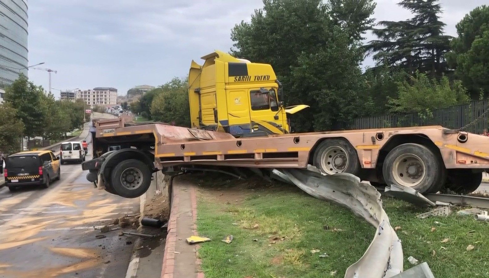 İstanbul Pendik’te yağmurun tesiriyle kayganlaşan yolda virajı alamayıp bariyere çarpan TIR askıda kaldı.