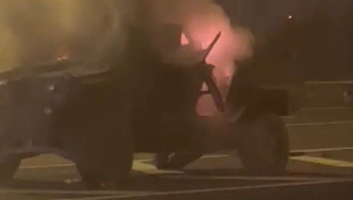 Araçta bulunan özel hareket polisleri dışarı çıkarak, yangın söndürme tüpü ile müdahale etmeye çalıştı.