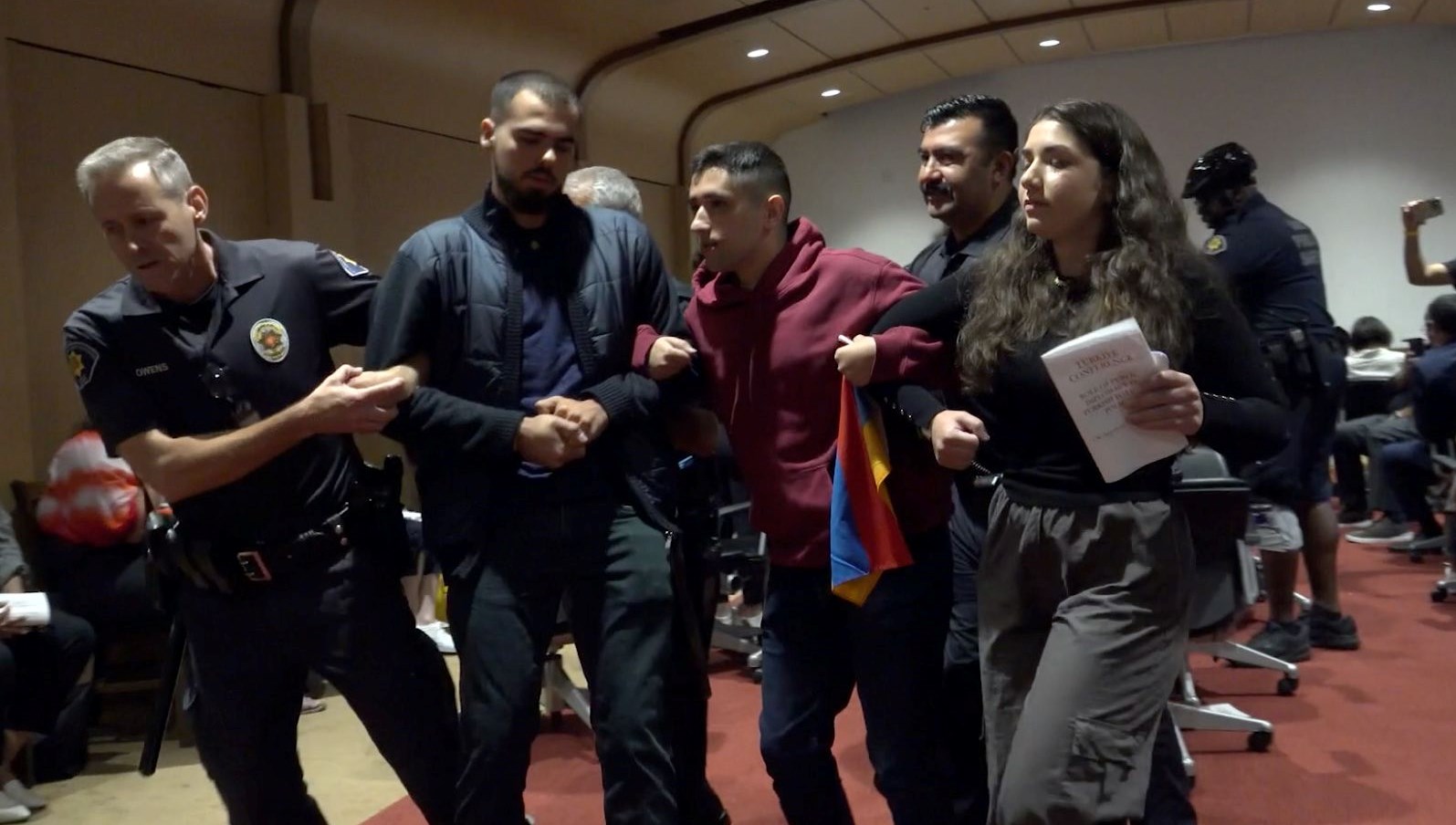 Türkiye’nin Washington Büyükelçisi Mercan’ın konuşmasını yapmak üzere kürsüye çıkmasıyla 11 kişilik öğrenci kümesi protestoya başlamıştı.