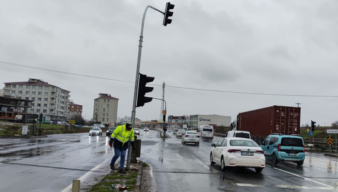 Vatandaşların ihbarı üzerine olay yerine gelen Tekirdağ Büyükşehir Belediyesi Trafik takımları zıt istikamete dönen trafik ışıklarını kazma yardımı ile çevirmeye çalışsalar da başarılı olamayınca olay yerine sepetli vinç çağırıldı.