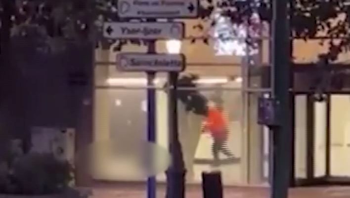 Görüntülerde turuncu kıyafetli saldırganın etrafa ateş açtığı görülüyor.