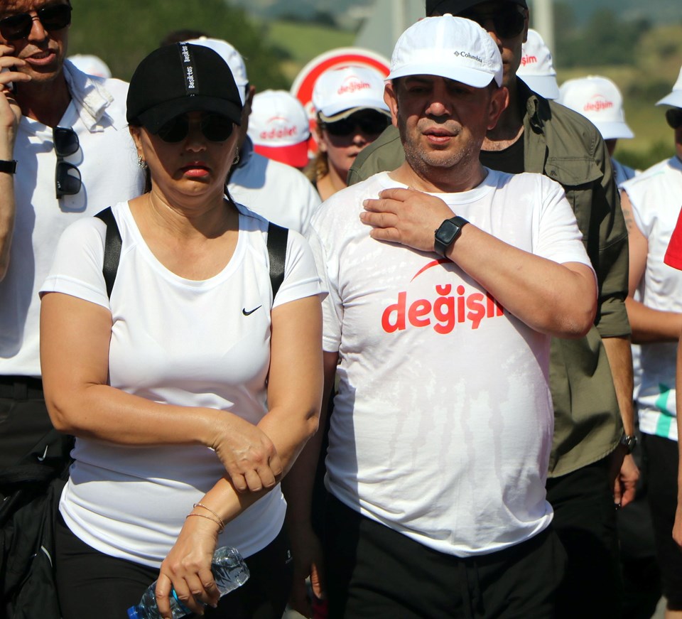 Tanju Özcan’ın eşi Meral Özcan da pazartesi gününden itibaren yanında yürüyerek eşine takviye oldu. Özcan, bugünkü yürüyüşünün birinci etabında, dik rampaların bulunduğu güzergahta sıkıntı anlar yaşadı.