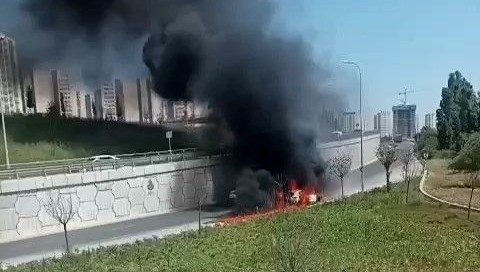TEM Otoyolu Bahçeşehir irtibat yolunda, seyir halindeki bir arabada yangın çıktı.