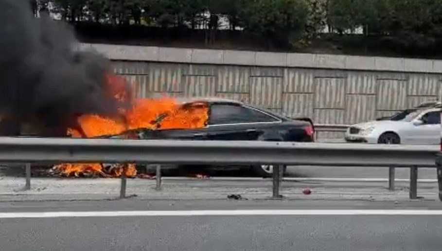 TEM Otoyolu Esenler mevki Edirne istikametinde otoyolda yaklaşık 1,5 milyon lira bedelinde olan lüks araba seyir halindeyken motor kısmında şimdi bilinmeyen bir nedenle yangın çıktı.