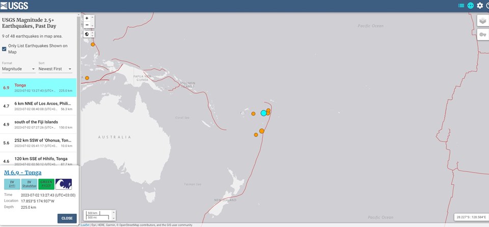 ABD Jeolojik Araştırmalar Kurumu (USGS), 6,9 büyüklüğündeki sarsıntının merkez üssünün, Tonga’nın Neiafu kentinin 132 kilometre kuzeybatısı olduğunu açıkladı.