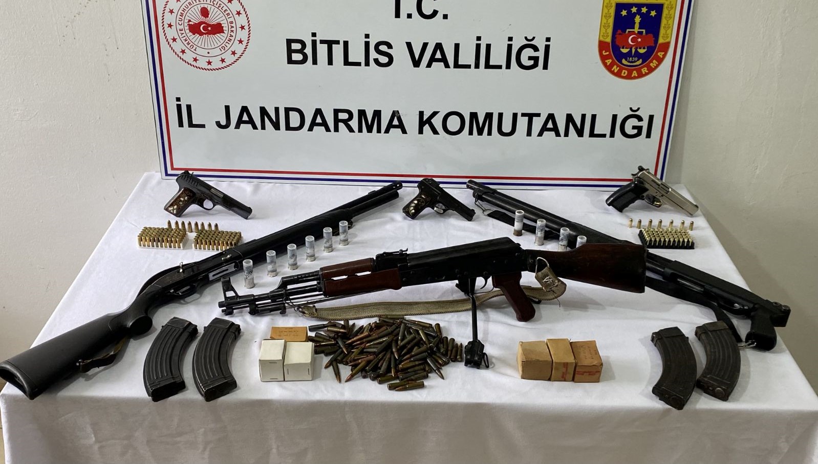 Tatvan ilçesinde 3 şahsa yönelik yapılan operasyonda mesken ve iş yerlerinde arama yapıldı. Aramalarda 1 adet AK-47 Kalaşnikof makinalı tüfek, 4 şarjör, 447 dolu fişek, 48 adet 7,62 mm boş kovan, 1 otomatik av tüfeği, 1 kurusıkı tabanca, 1 pompalı tüfek, 1 tabanca ve 1 menşei belirli olmayan tabanca ele geçirildi.