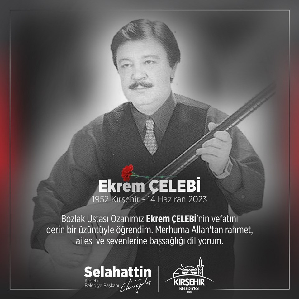 İç Anadolu ve Bozlak müziğinin temsilcilerinden Ekrem Çelebi, 70 yaşında hayatını kaybetti. Kırşehir Belediye Lideri Selahattin Ekicioğlu, Ekrem Çelebi’nin vefat haberini;” Bozlak Ustası Ozanımız Ekrem Çelebi’nin vefatını derin bir hüzünle öğrendim. Merhuma Allah’tan rahmet, ailesi ve sevenlerine başsağlığı dilerim.” kelamlarıyla duyurdu.