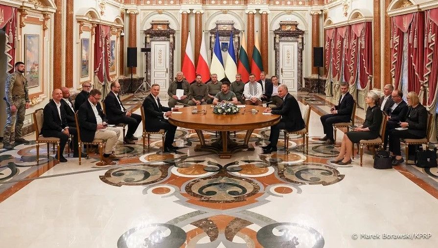 Polonya Cumhurbaşkanı Andrzej Duda, Litvanya Cumhurbaşkanı Gitanas Nauseda ile birlikte Ukrayna Anayasa Günü münasebetiyle Ukrayna’nın başşehri Kiev’de Ukrayna Devlet Lideri Vladimir Zelenskiy ile bir ortaya geldi. Cephedeki son gelişmeleri, Rusya’daki Wagner isyanını ve Zaporijya Nükleer Santrali etrafındaki son durumu ele alan üç başkan, daha sonra ortak basın toplantısı düzenledi.