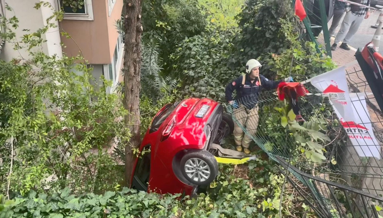 Otomobiliyle ilerleyen şoför Neslihan Akın direksiyon hakimiyetini kaybetti. Araba 4 katlı binanın tel örgülerini aşarak 3 metre yükseklikten bahçeye düştü.