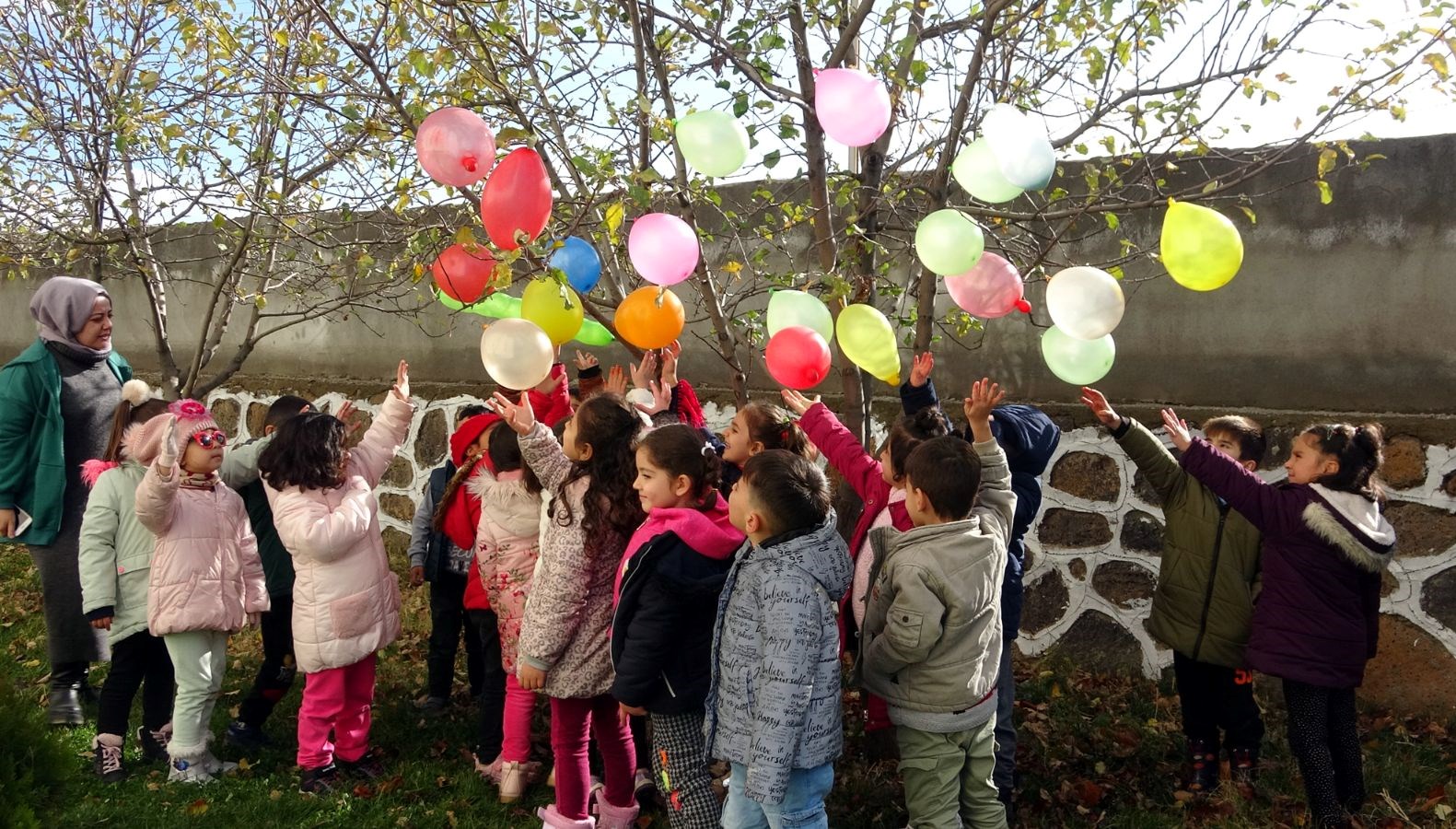 Erciş’in Tekevler Mahallesi’ndeki İlçe Müftülüğü’ne bağlı Kur’an kursuna giden 6-7 yaş ortası 30 öğrenci, İsrail’in Gazze’ye yönelik akınlarında ölen çocuklar için kursun önündeki ağaçların kollarına balonlar astı, savaş istemediklerini söyledi.