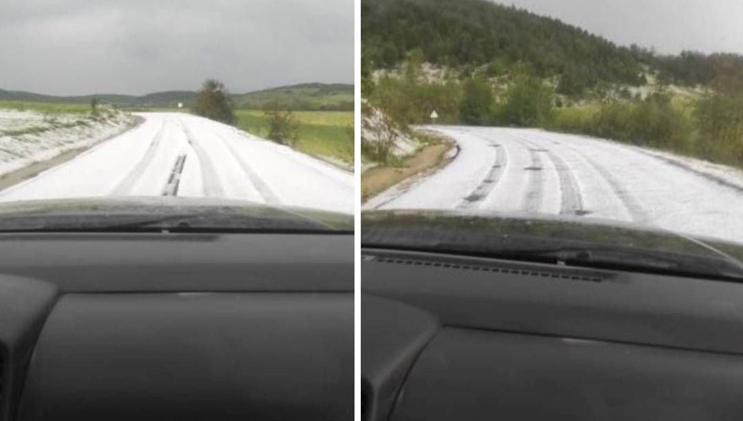 Çukurgelik köyünde, şiddetli doluyla birlikte her taraf bembeyaz oldu.
