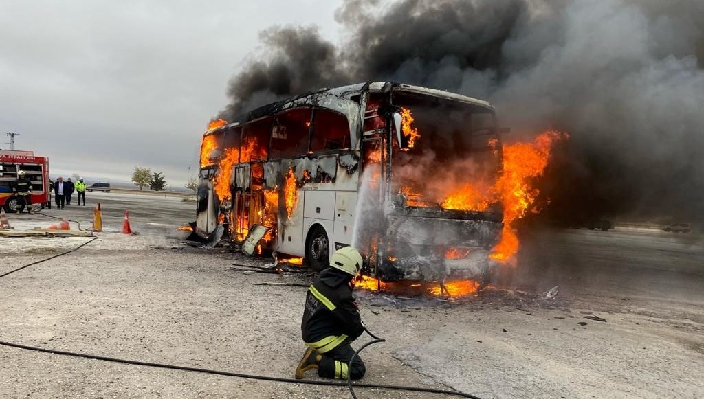 İzmir’den Hatay’a seyreden Abdullah Yalman yönetimindeki yolcu otobüsü, Adana-Konya kara yolu Çakmak Mahallesi yakınlarında saat 08.00 sıralarında motor kısmından alev aldı.