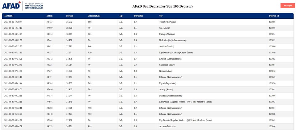 Deprem haberilerine gün içerisinde yenileri ekleniyor. Başta merkez üssü olmak üzere etraf vilayetlerde de hissedilen zelzeleler akabinde gözler İçişleri Bakanlığı Afet ve Acil Durum İdaresi Başkanlığı’na (AFAD) çevriliyor. AFAD, gün içerisinde meydana gelen zelzeleleri anlık olarak paylaşıyor. İşte 30 Ağustos’a meydana gelen sarsıntılar hakkında bilgiler…